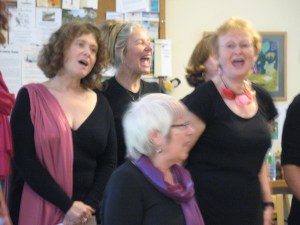 We warmed up (physically and singing wise) in the communal space, and sang our two new songs again, a quick break for chocolate muffins and then the Trade Winds Pioneers went through their set for us; an eclectic mixture of English, French, Maori, African and American songs, typical of the Raise the Roof catalogue.  My particular favourite was a  spritely version of Take 5 – I didn’t know it had words! I shall treasure Mood Indigo being pitched so low everyone collapsed, and was reminded once again that Autumn Leaves is better in the original French.
