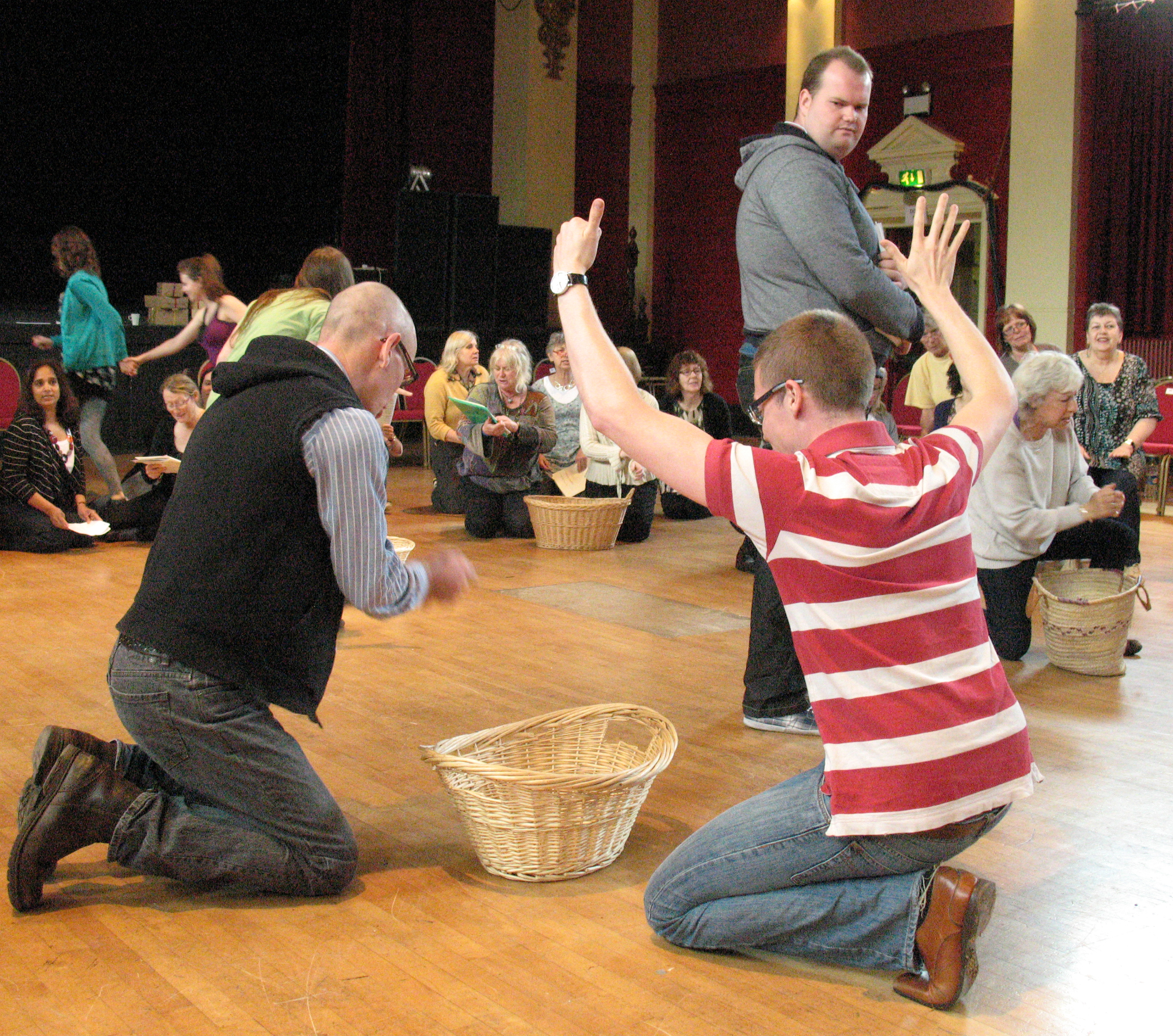Harry walks us through our first entrance.  This involves us crushing into a tiny space off stage (in the right order, with our baskets) and singing our heads off, then coming in, and arranging ourselves around the ‘garden’ while Larina (Harry, at this point)  thanks us for our song and sets up the corn husking contest.  This proves a bit harder than you’d think, because there really isn’t room and we can’t see our cue.  Fortunately by this time Nick has escaped from the channel tunnel and comes to make the crush even tighter.  We can only fit by holding the baskets length ways, which isn’t going to be possible when they are full of corn cobs… and there are 30 children to fit in yet.