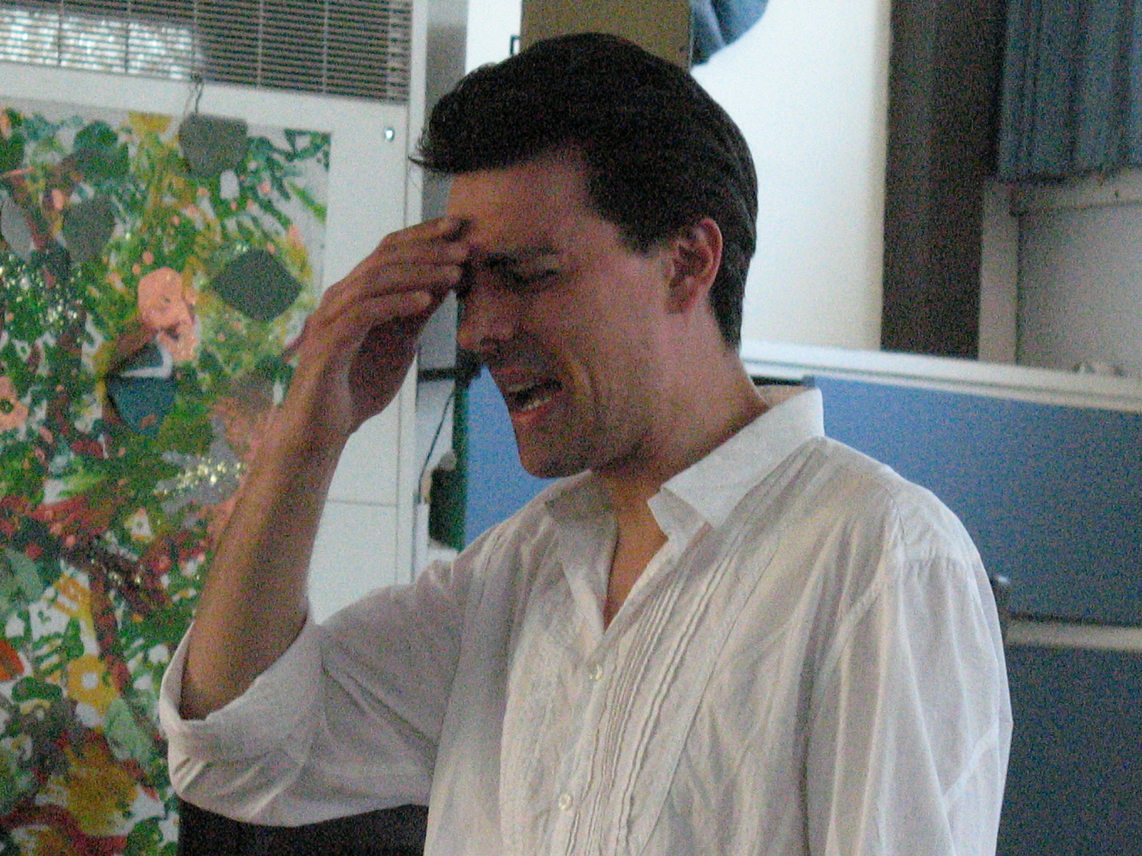 Acting wise, most people in the chorus are just walking through their parts, maybe it’s the heat, or the ‘done it already’ mentality seeping in, but there isn’t the verve or commitment to the parts we’ve already ‘acted’. Part of the problem is there are a lot of people missing today, so people are deputising for key roles (mainly involving moving chairs for the Cotillion, which we try at least 5 times without getting it done neatly and in time; this is a feature of a Harry Fehr production, moving furniture: last year it was tables, and I had to bow out of that bit.) it could also be that the venue is small and we don’t have room to fling ourselves about as we might otherwise. It is very frustrating, especially when there’s Katie and Damian acting away like mad, and Panos quite bringing a tear to my eye as M. Triquet wisting after Tatyana (almost another missed cue.) If I didn’t know we always pull it together at the end, I’d be quite worried.