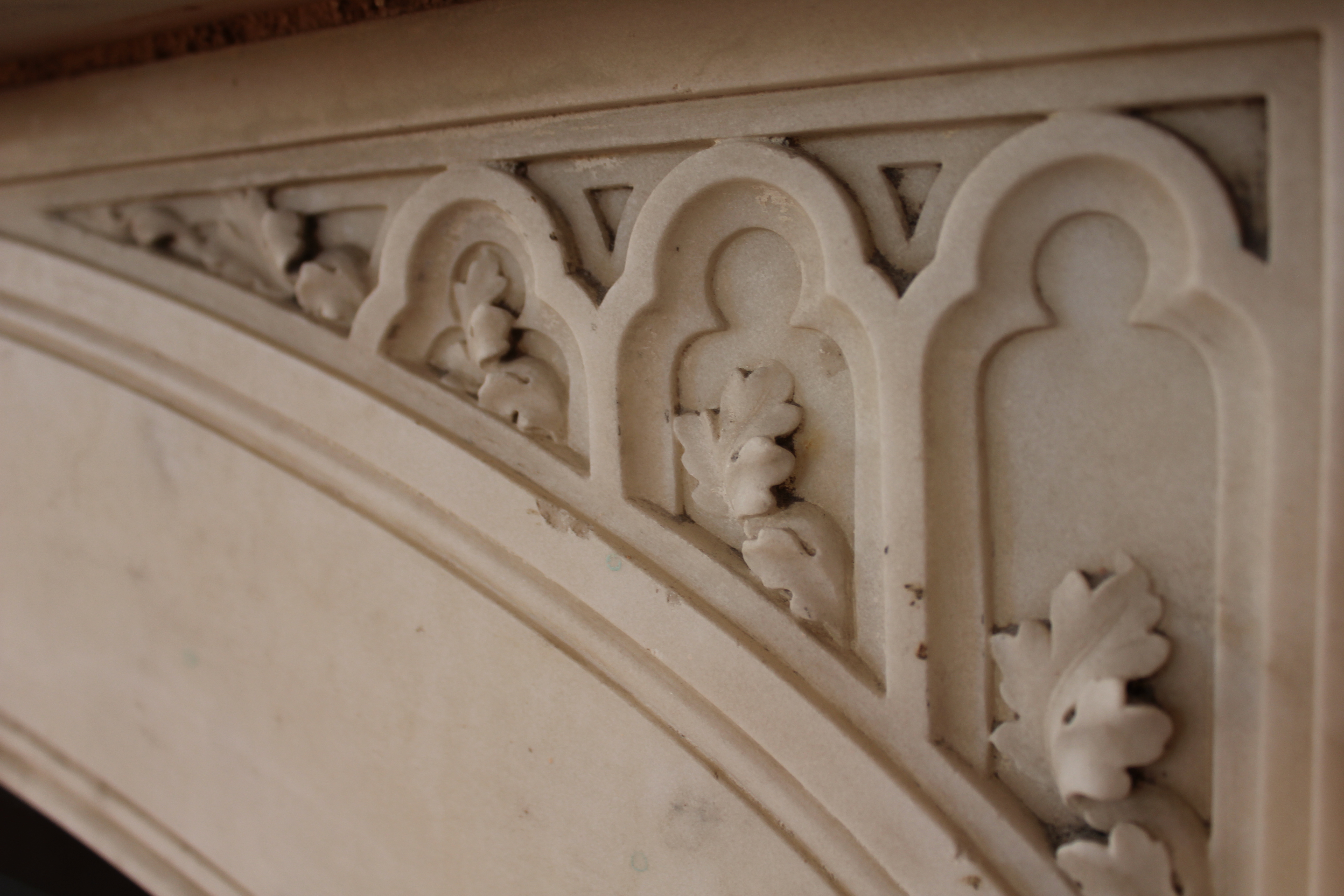 Up the stairs this layout is replicated, (although the bathroom is less successful, extraordinary 1980’s tiles and a bath too narrow to get both shoulders into!) then a further short flight takes you to the best bedroom at the top of the square tower, which A and I get, much to my delight. This is painted a not entirely successful shade of apricot which could do with being a bit yellower, but has 3 sets of Gothick arched windows on two sides, and a beautiful marble fireplace, on which delicate oak leaf carvings overflow the recessed arches in the spandrels.