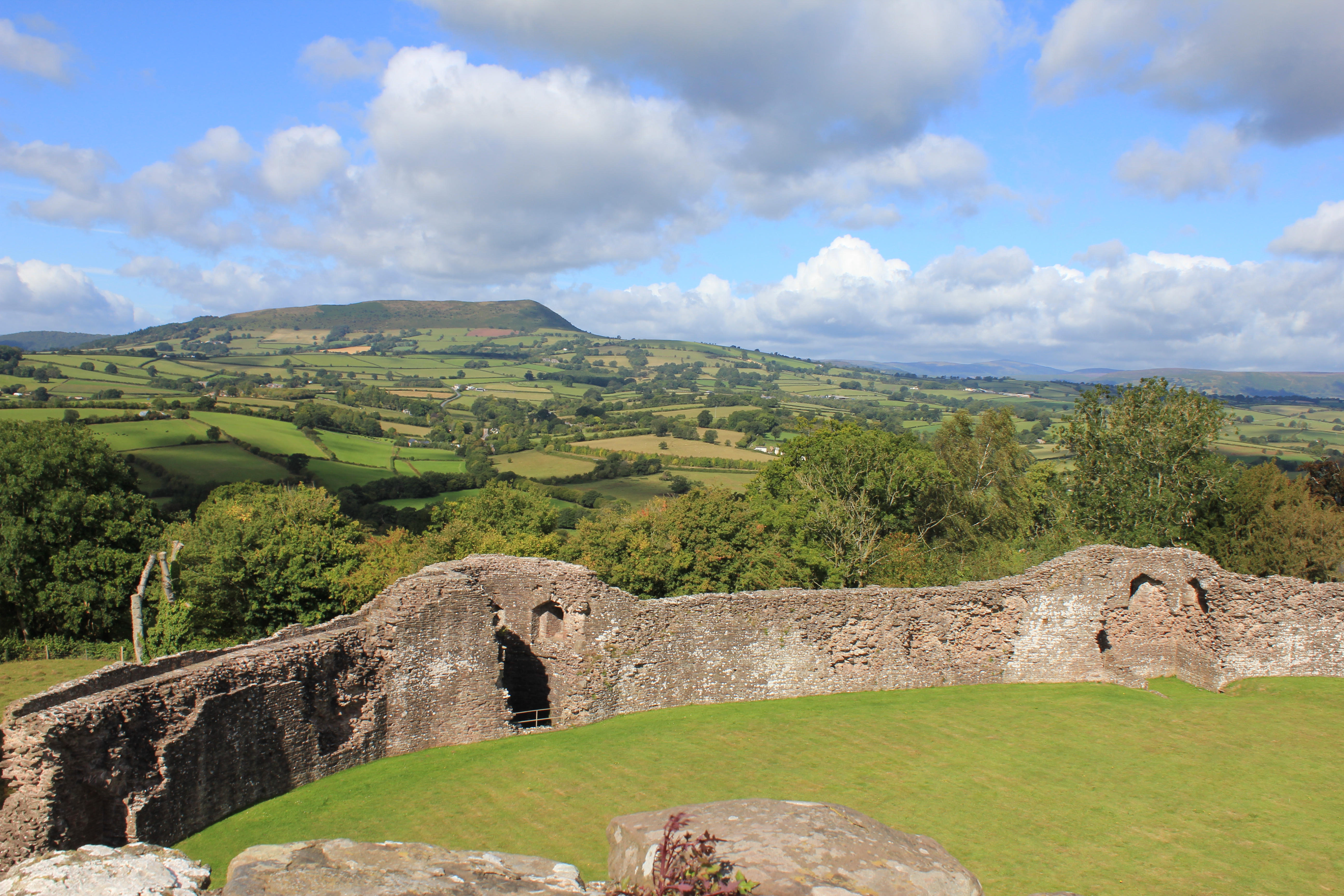 Monday and despite T’s insistence of an 80% chance of rain it is a beautiful sunny, chilly morning. But we are slow to get going or make a decision as to where to go. Eventually we agree on White Castle and a circular walk utilising part of Offa’s Dyke and the Three Castles walk. The weather is perfect, bright, blowy and brisk. The castle (which A & I visited when on holiday with friends at Longtown about fifteen years ago) is just as good as I remember – enough standing to be able to get to the top of one of the towers, plenty of steps to go up and down, and sufficiently ruined to give a magnificent echo. Views all round spectacular. The walk also has just the right amount of views, hills, rivers and bridges; and the rain, which we can see settling in on Crug Hywel, doesn’t reach us until we are back at the car. We drive back to our genteel pink castle and eat leftover curry for lunch and then distribute ourselves around the living room in varying states of sleepiness, until it’s time for Daisy’s afternoon walk. A, Jn and I take her through the wooded pit (a small quarry once?) beside the drive, and out onto the hill for yet more views and once more the rain holds off until we arrive back. I settle down with a book from the shelf, The Bank Manager and the Holy Grail, by Byron Rogers, a very entertaining and sometimes moving collection of essays about Welsh characters and eccentrics. T & Jm provide an excellent dinner. No one stays up long.