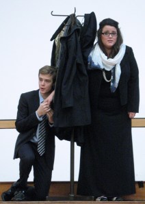 The Regent Hall is an obscure performing space, right on Oxford Street but almost invisible. It is a massive echoing space, and the singers had a lot of stage room to fill too: much effective use is made of a coat stand centre stage, hiding in turn: Cherubino, Figaro, the Boss and Mrs Boss; this last played by Emily Garland typically mopey, and rather static, but her voice is amazing: vibrant, clear and delectable, her duets with Susanna (Emma-Claire Crook) were particularly fine.