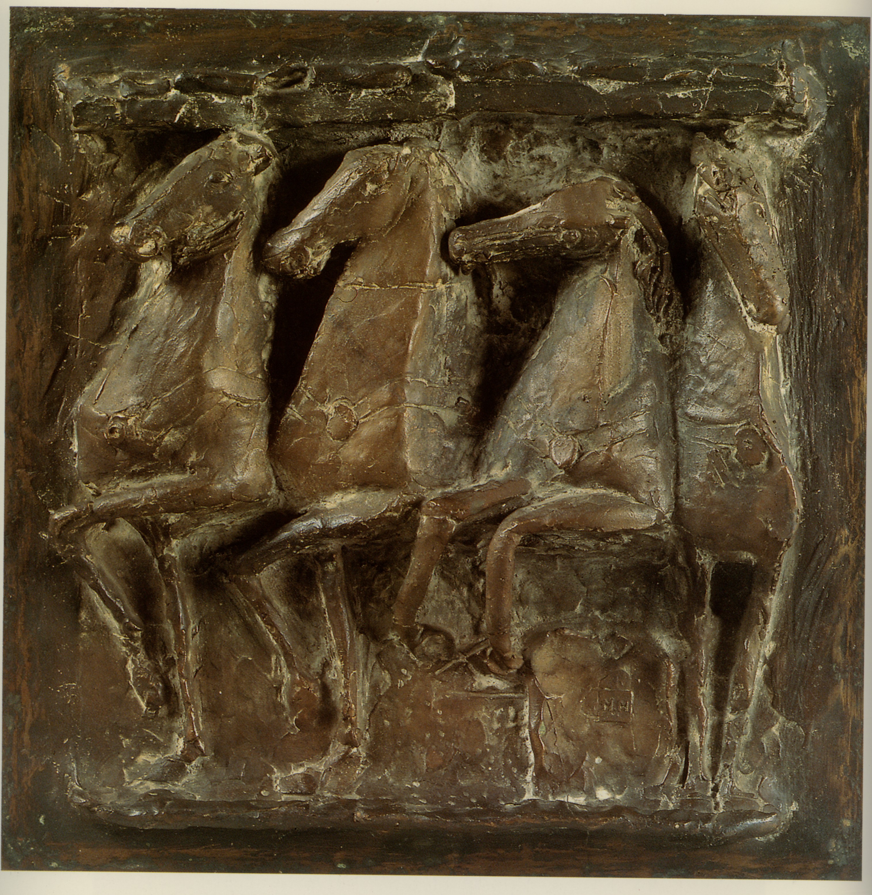 There are a few sculptures: I especially liked Marino Marini‘s Quadriga, a wall plaque of four horses face-on, crowding through a doorway knees raised as if contemplating a delicate can-can, that had overtones of ancient Rome.